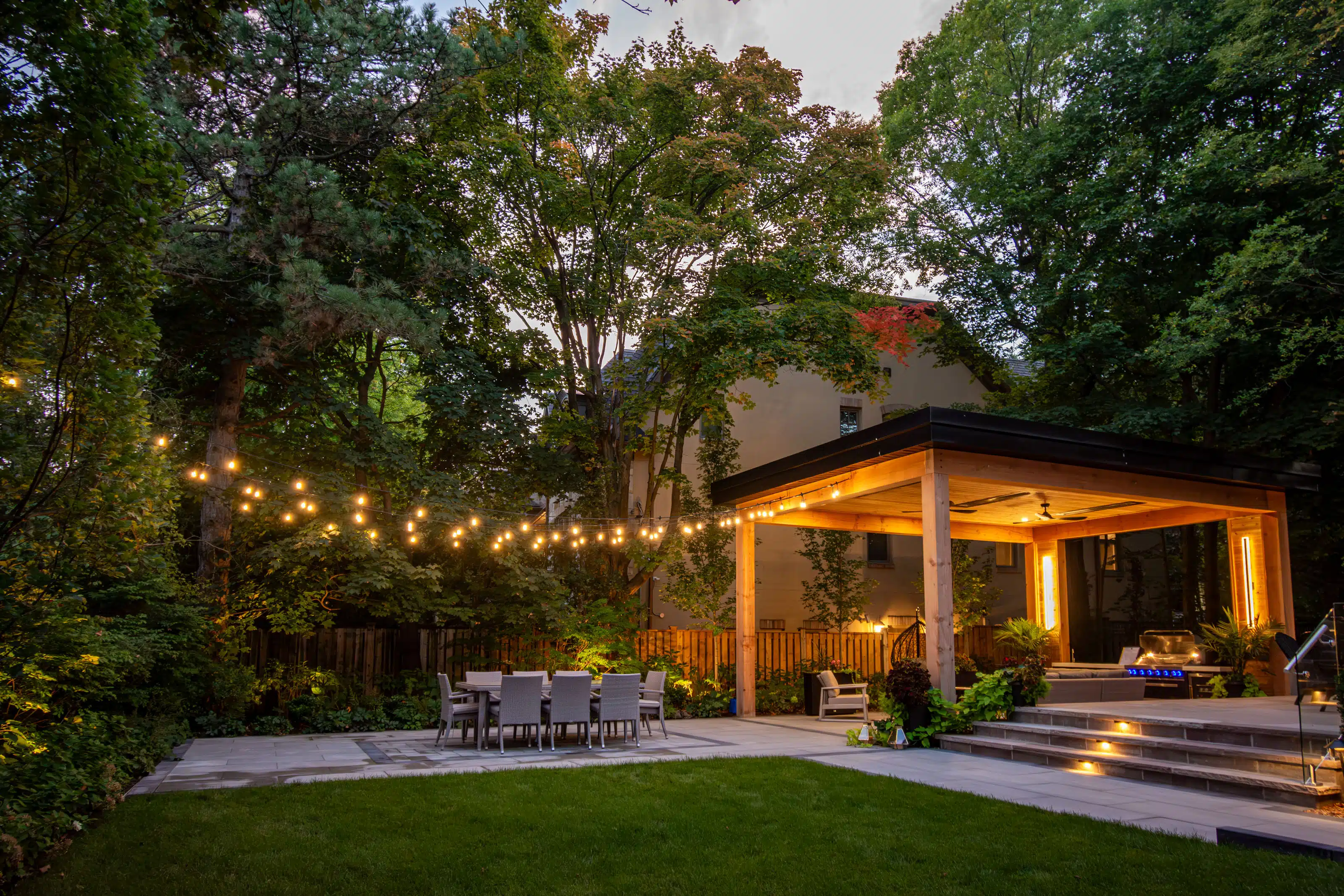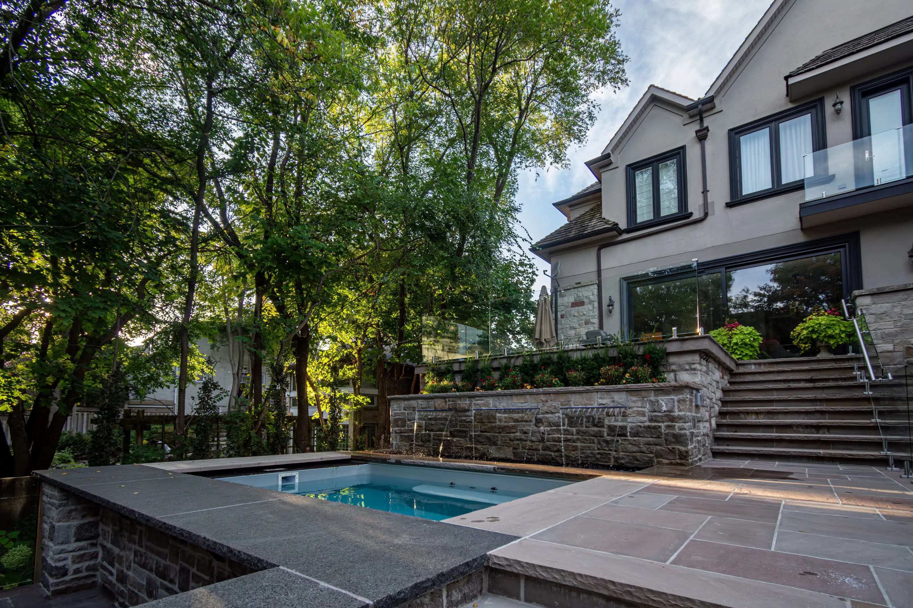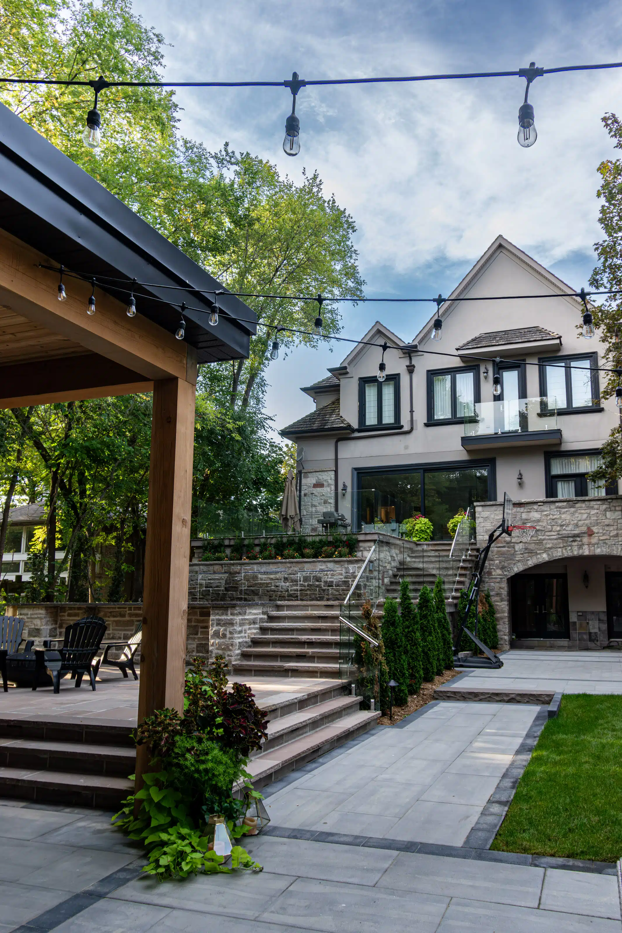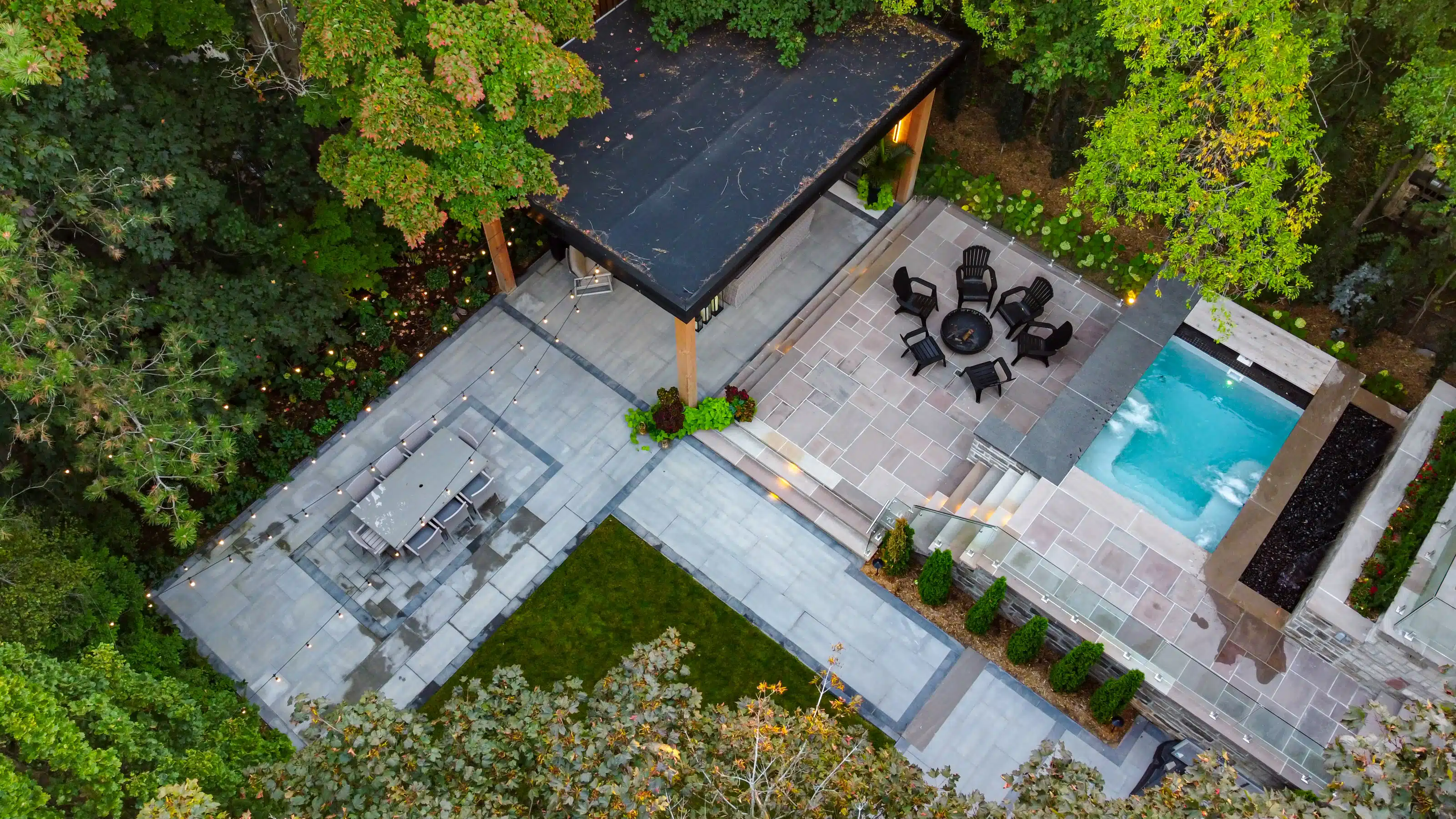 Located in Toronto, this stunning property features multiple areas perfect for recreation and relaxation. A series of raised patios featuring a spa with accompanying water wall, followed by a fire pit lounge, all culminating in the pavilion that houses ample entertainment space, connects the elevated kitchen walkout to the greater backyard.