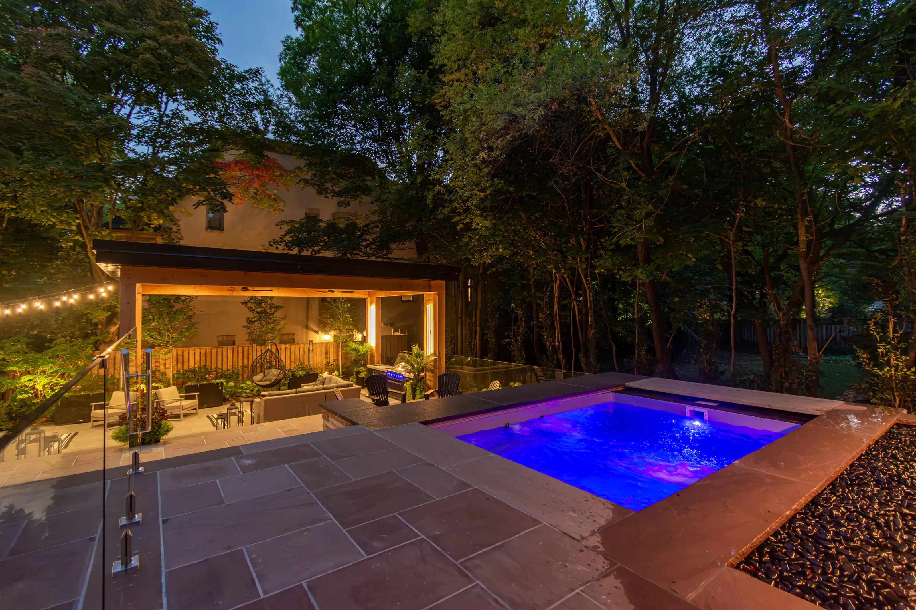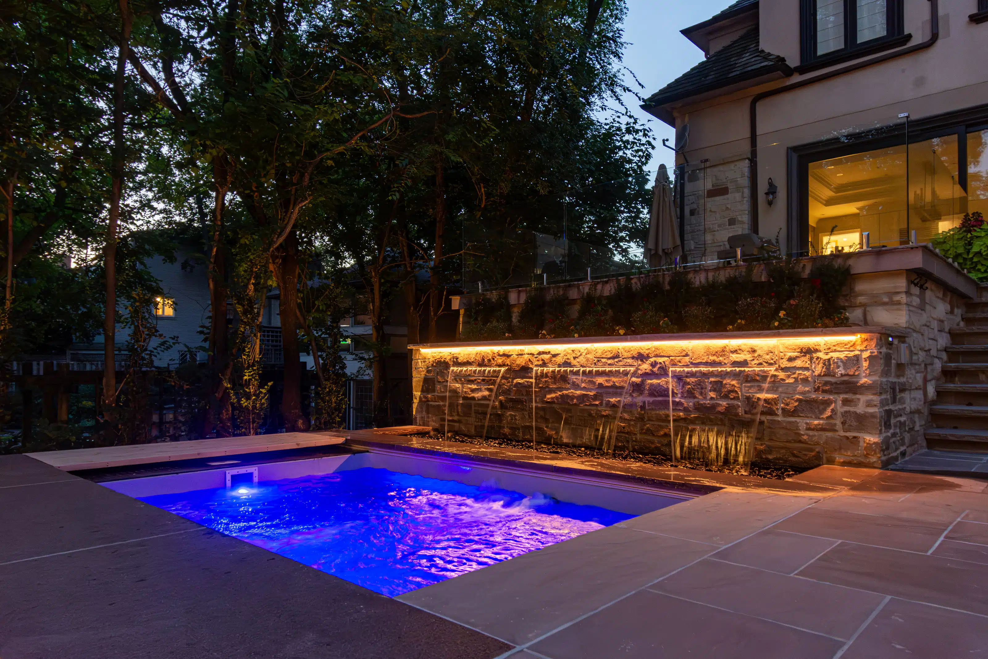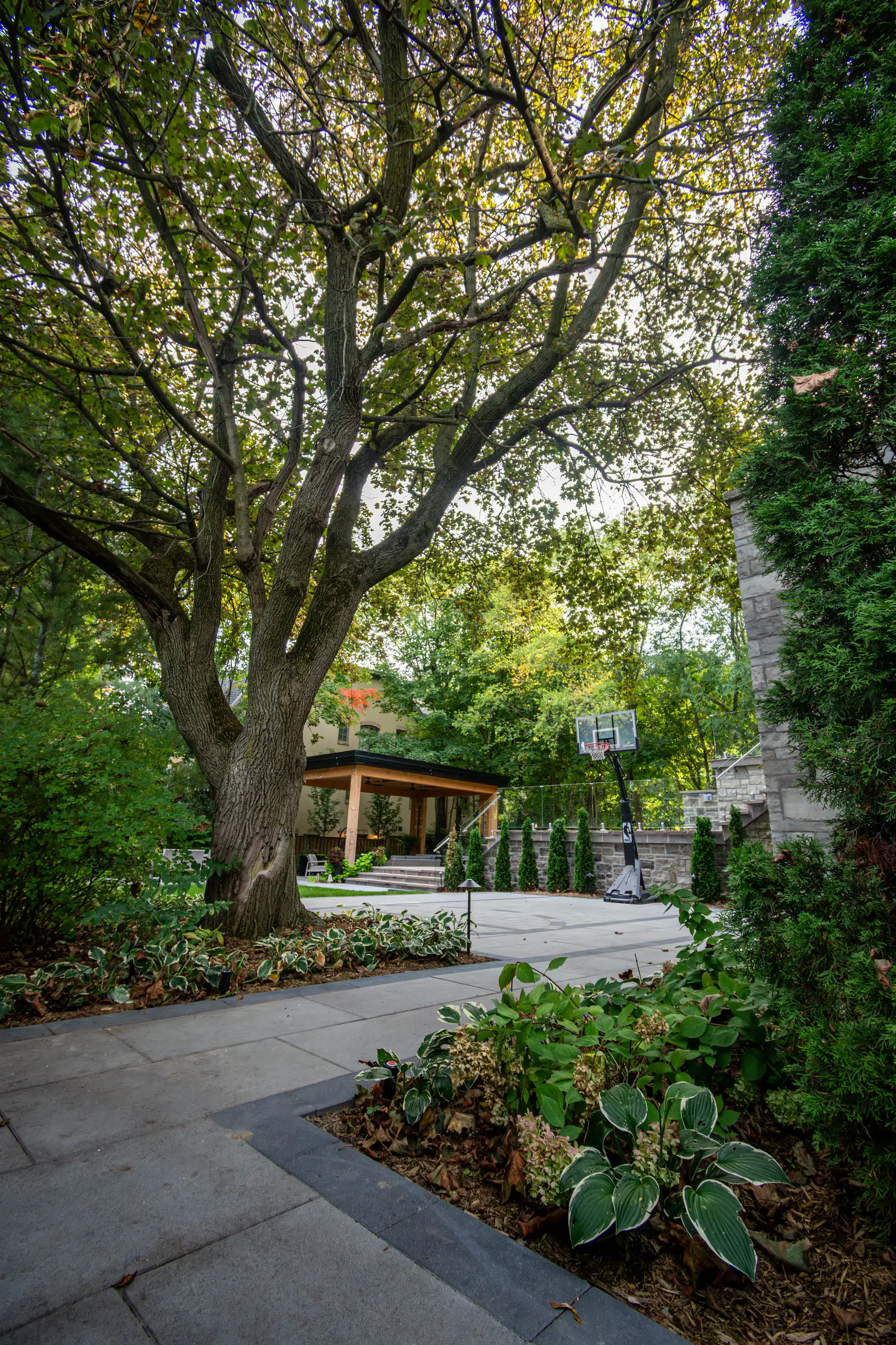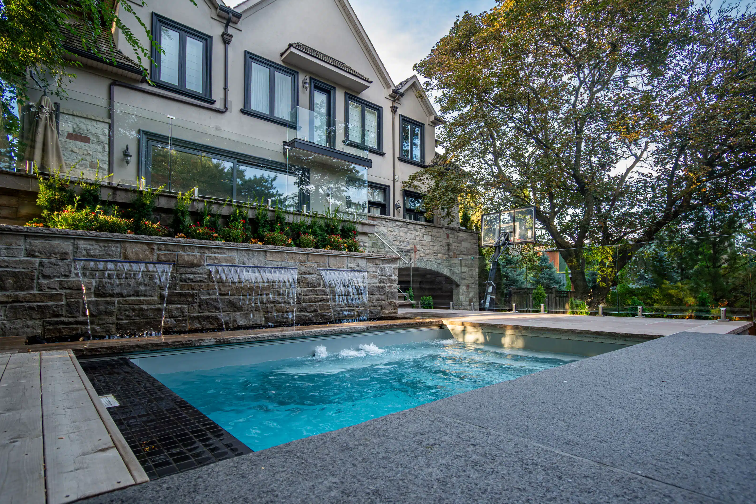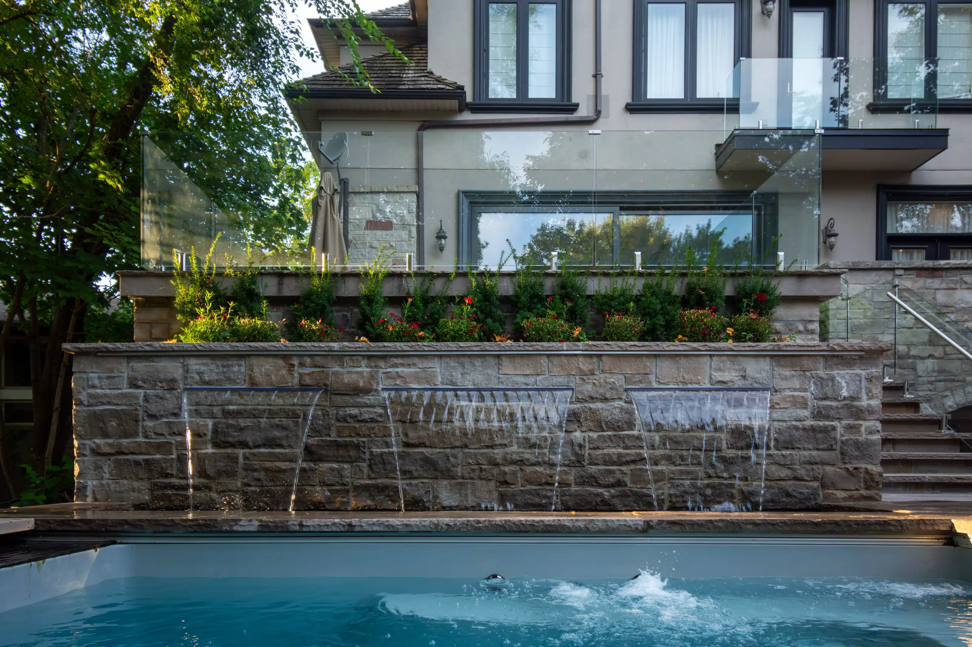 Located in Toronto, this stunning property features multiple areas perfect for recreation and relaxation. A series of raised patios featuring a spa with accompanying water wall, followed by a fire pit lounge, all culminating in the pavilion that houses ample entertainment space, connects the elevated kitchen walkout to the greater backyard.