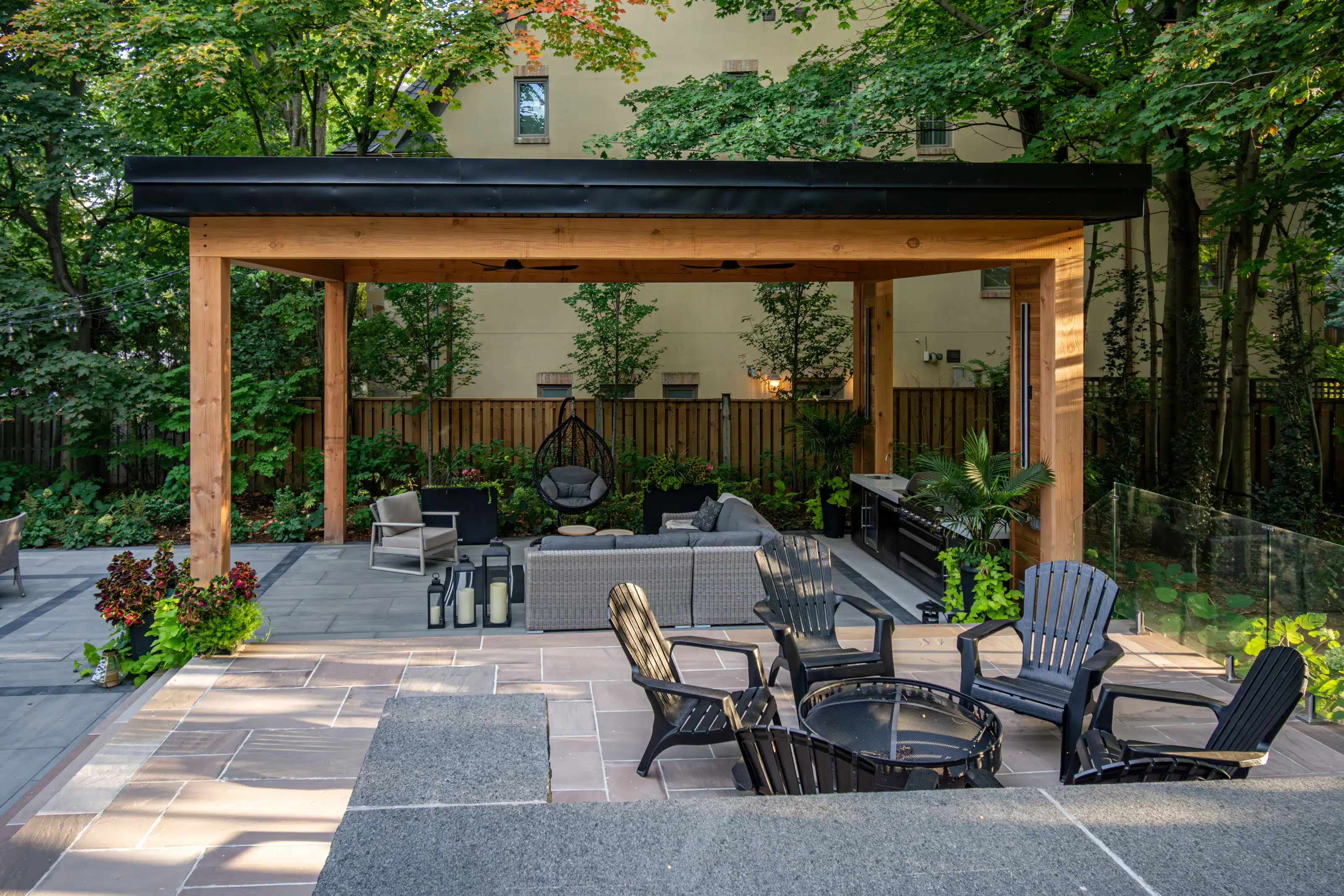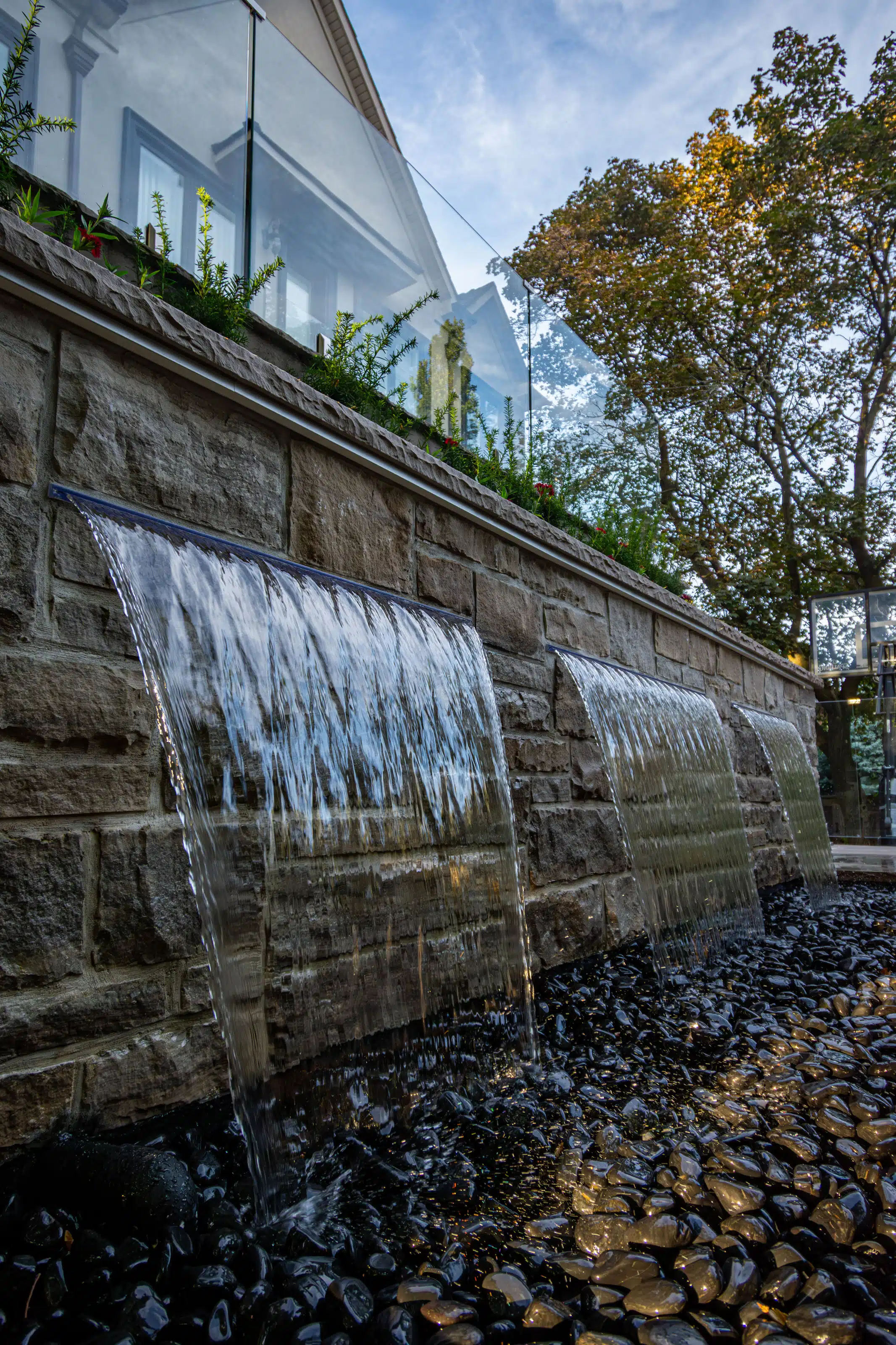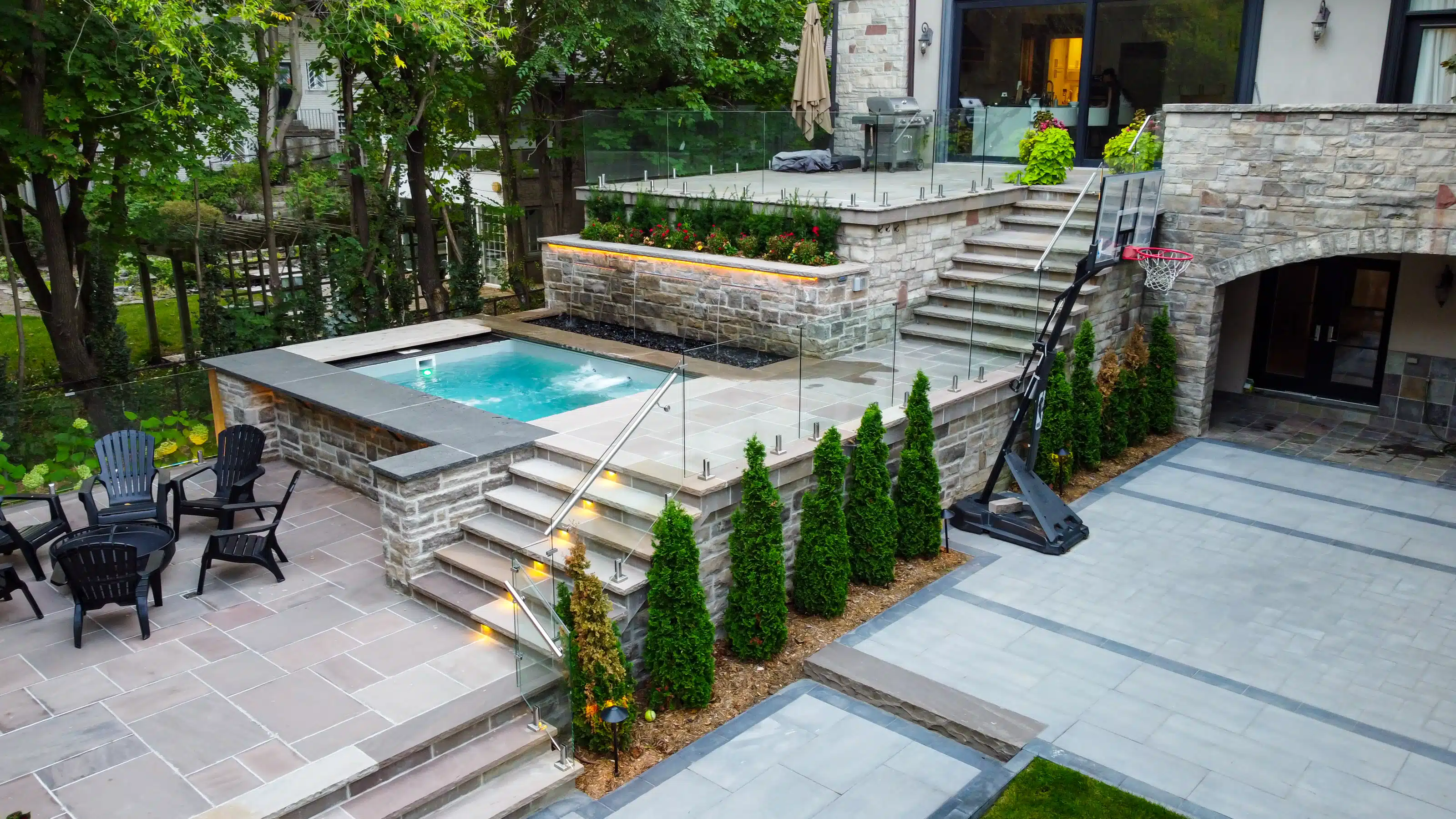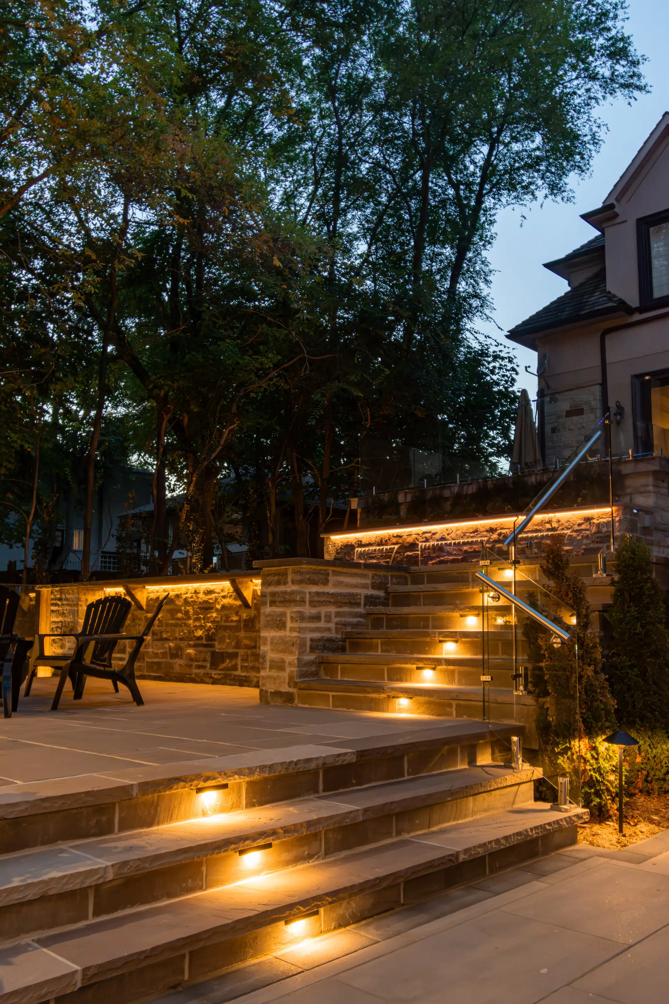 Located in Toronto, this stunning property features multiple areas perfect for recreation and relaxation. A series of raised patios featuring a spa with accompanying water wall, followed by a fire pit lounge, all culminating in the pavilion that houses ample entertainment space, connects the elevated kitchen walkout to the greater backyard.