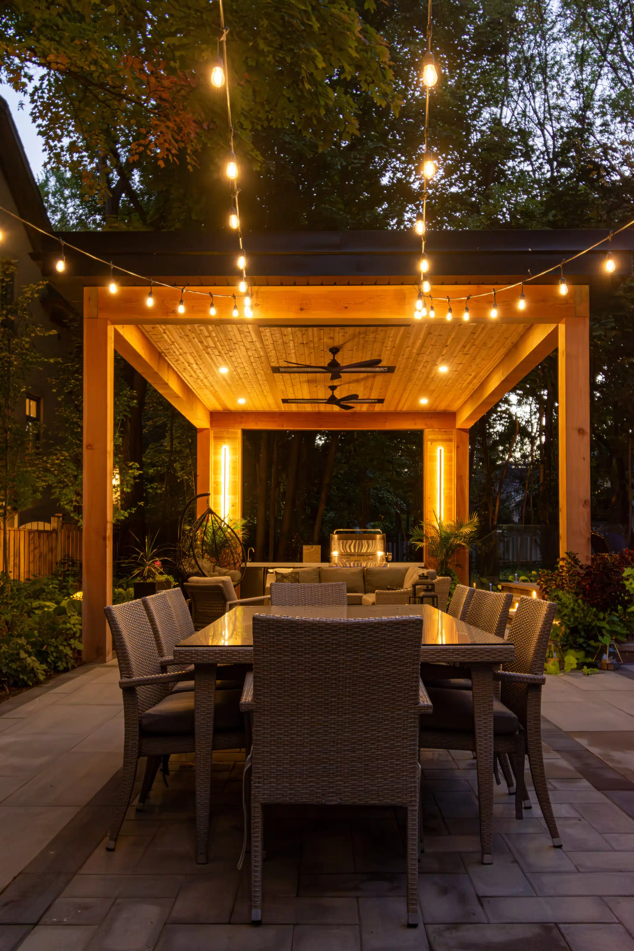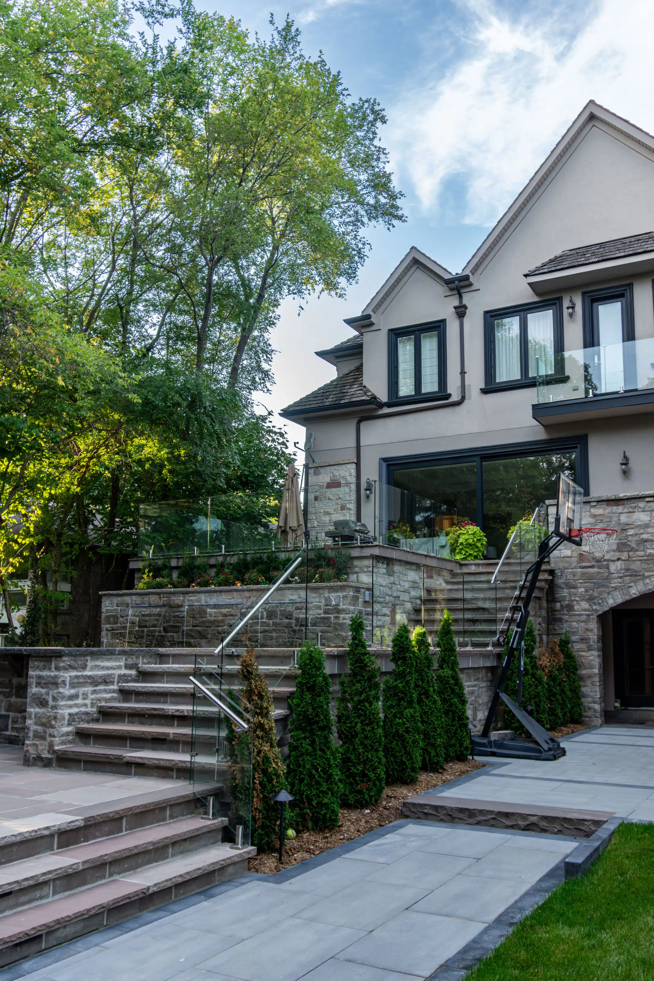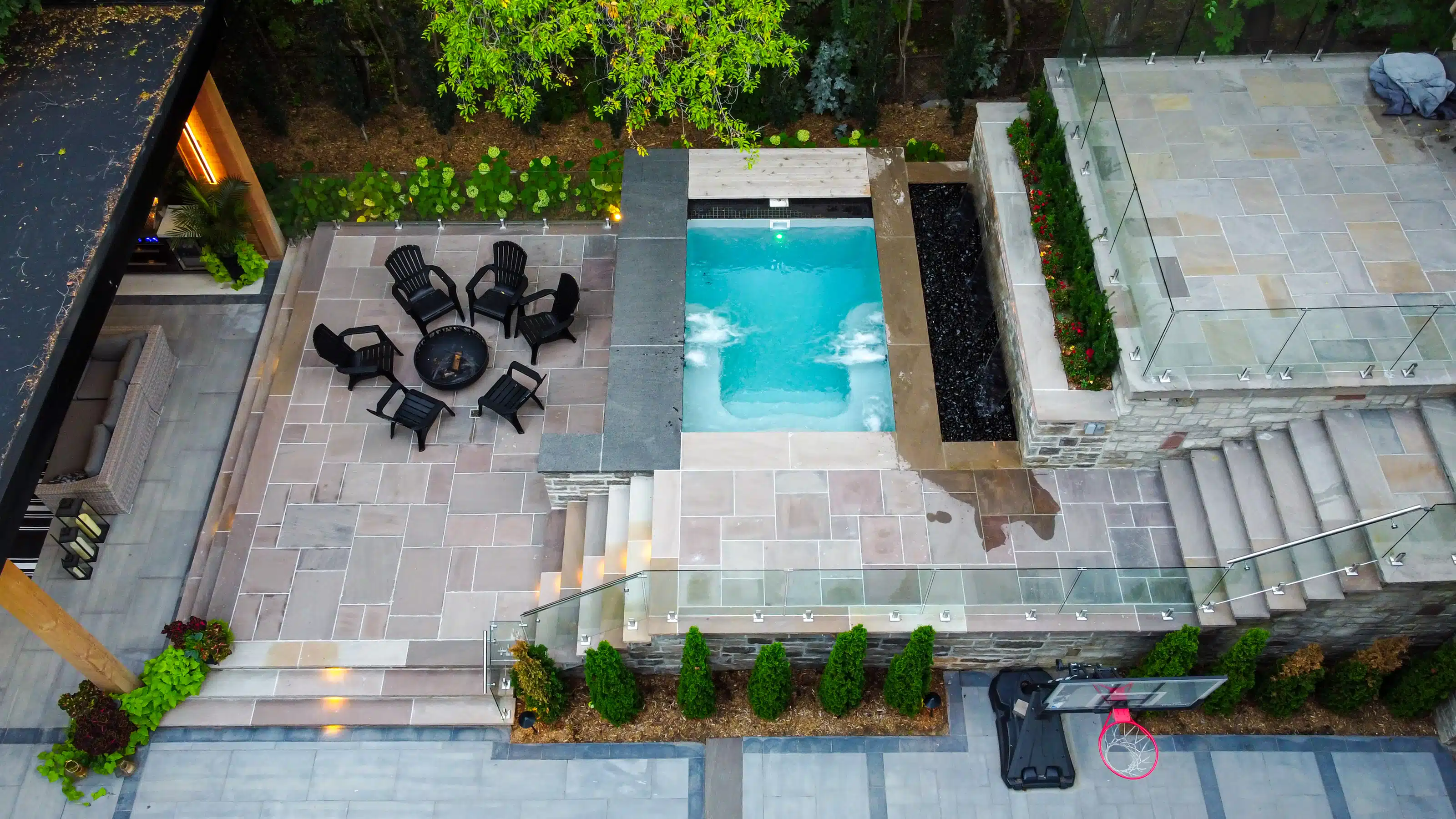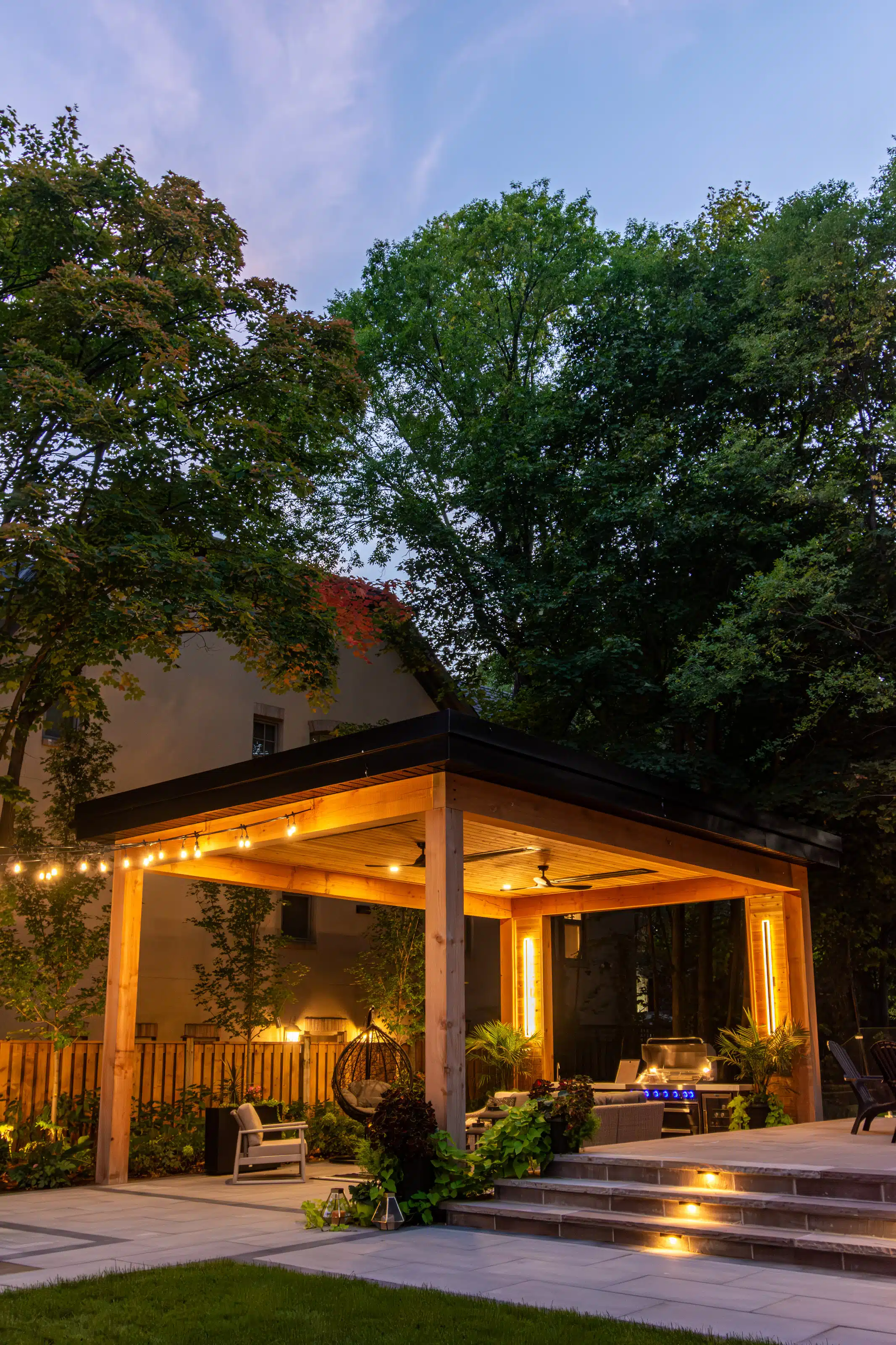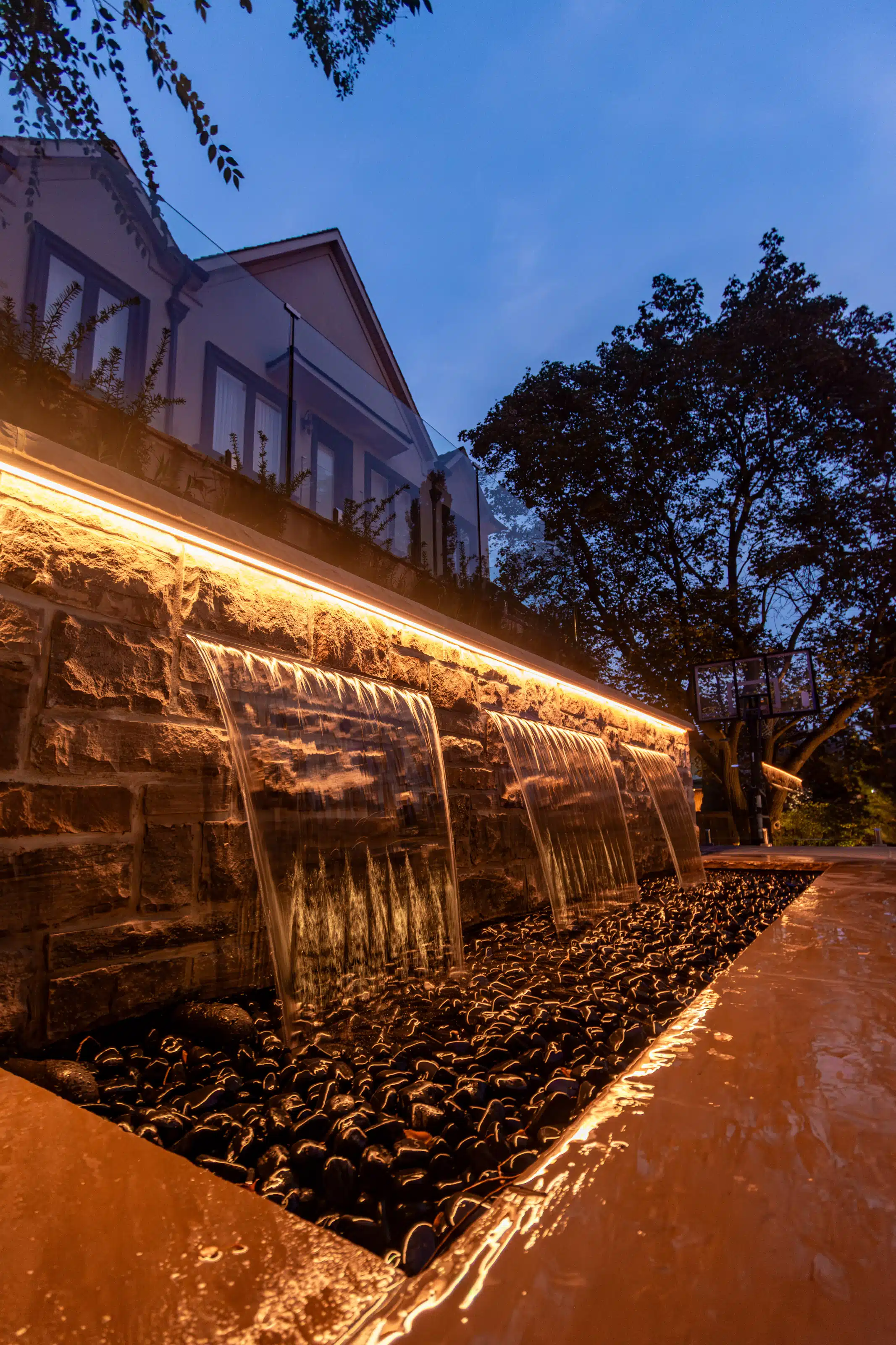 Located in Toronto, this stunning property features multiple areas perfect for recreation and relaxation. A series of raised patios featuring a spa with accompanying water wall, followed by a fire pit lounge, all culminating in the pavilion that houses ample entertainment space, connects the elevated kitchen walkout to the greater backyard.