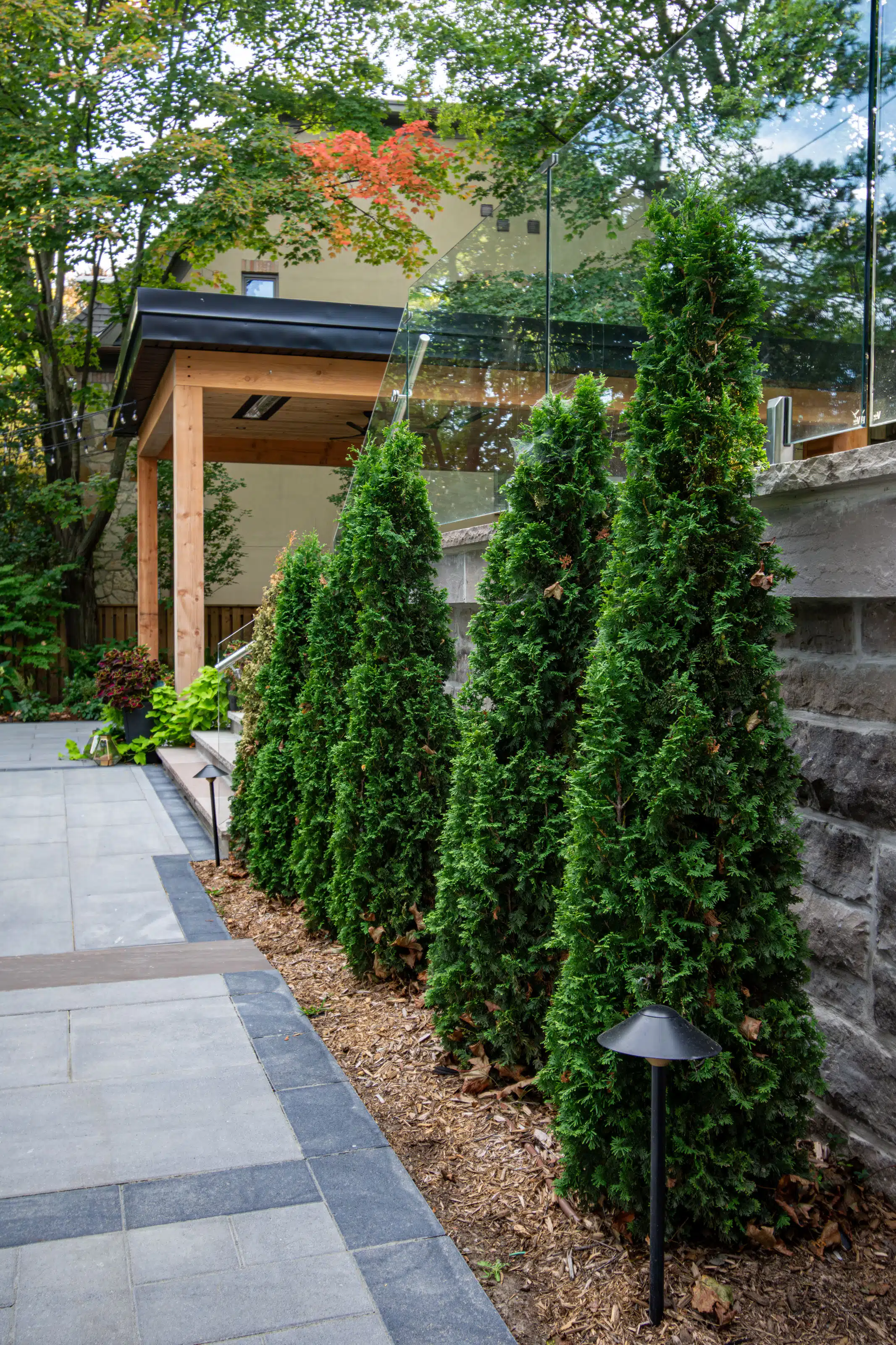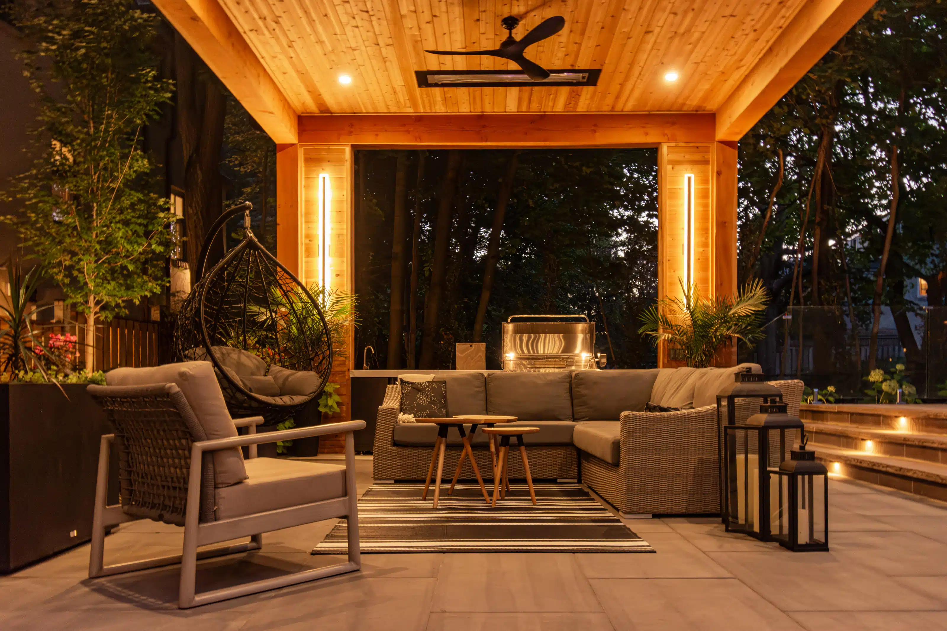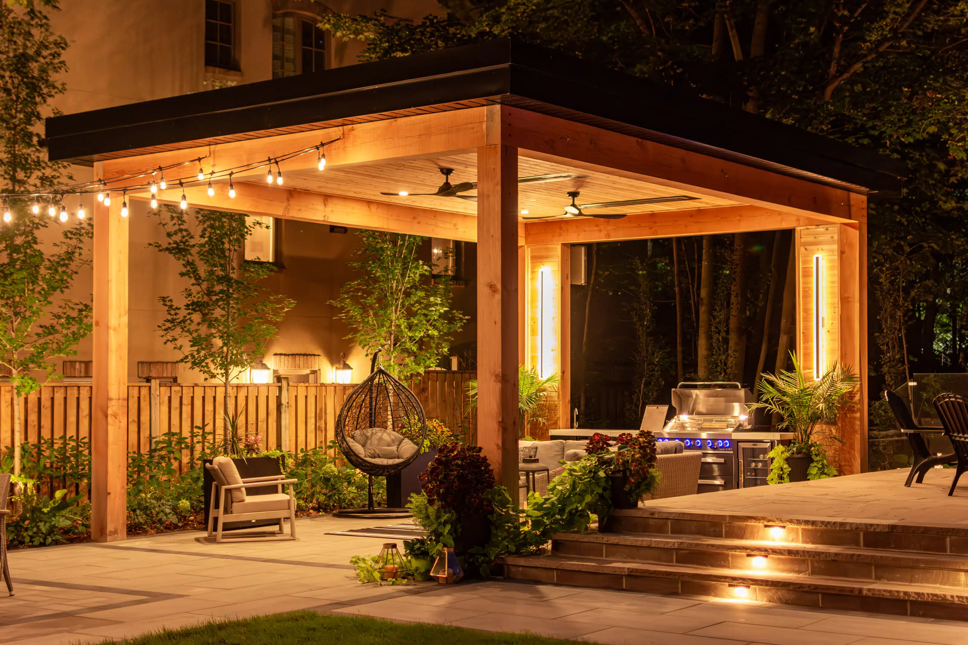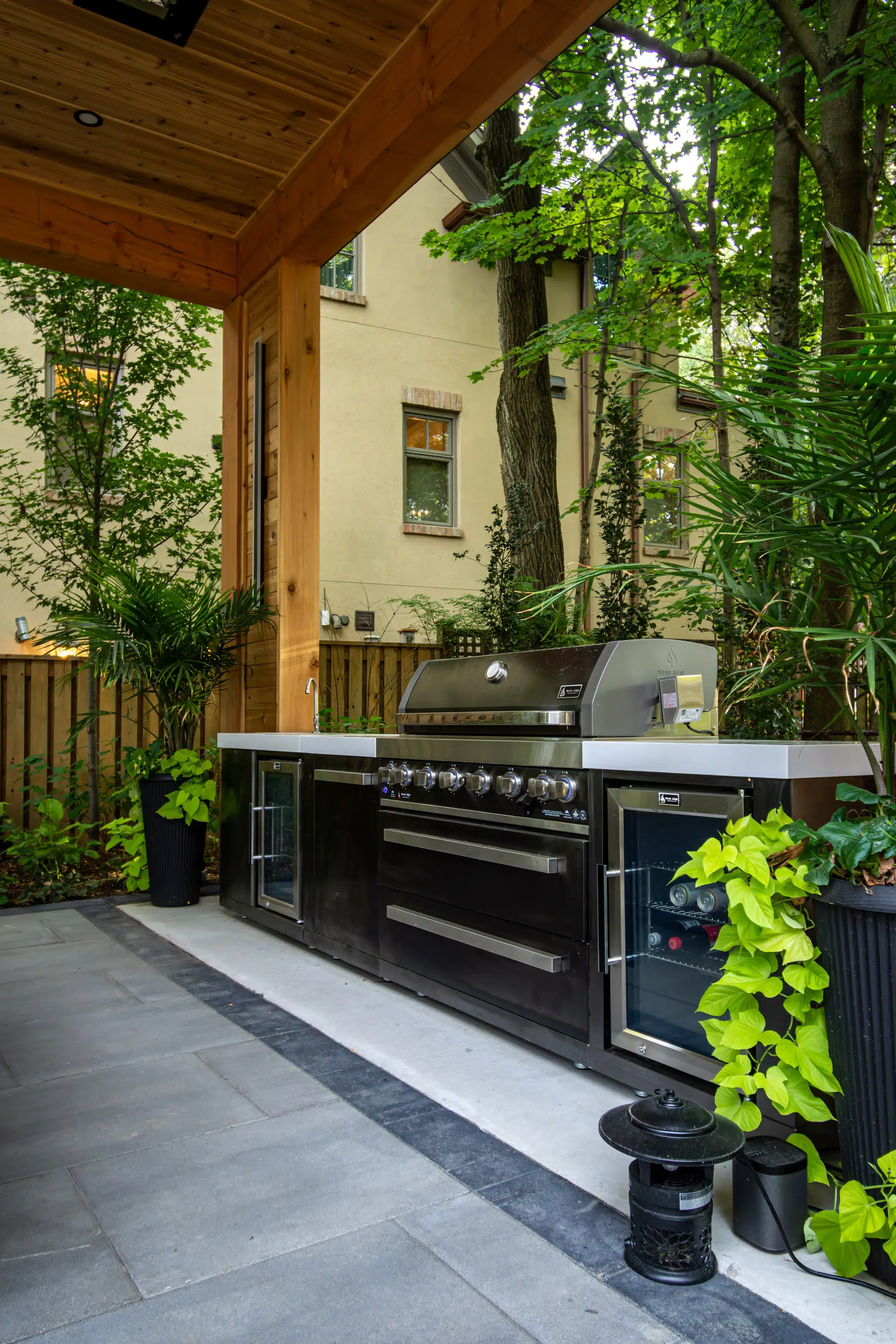 Located in Toronto, this stunning property features multiple areas perfect for recreation and relaxation. A series of raised patios featuring a spa with accompanying water wall, followed by a fire pit lounge, all culminating in the pavilion that houses ample entertainment space, connects the elevated kitchen walkout to the greater backyard.